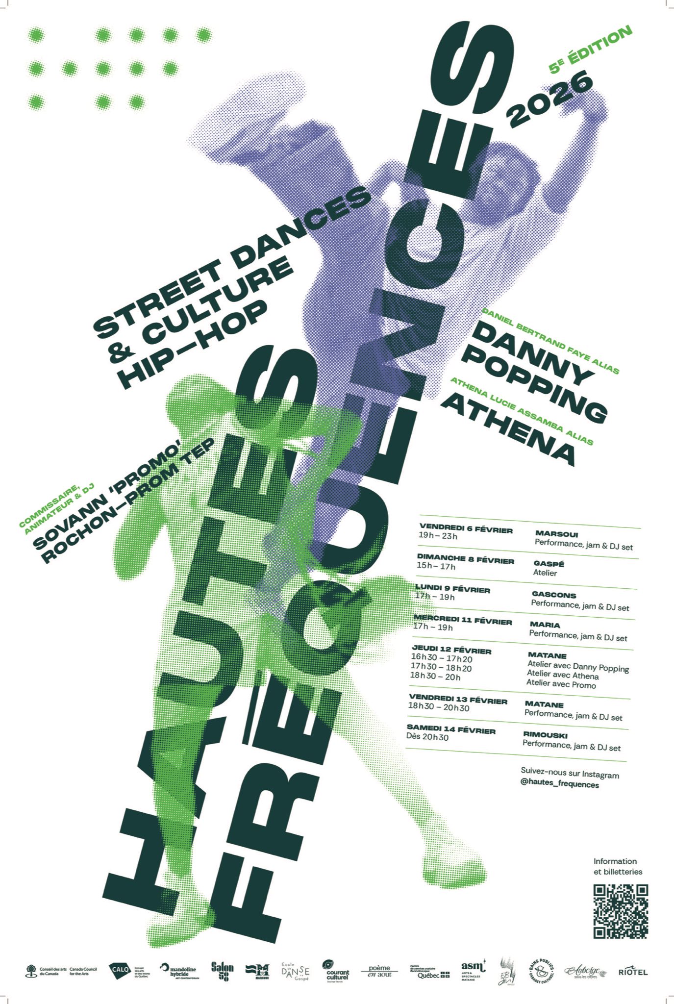 Du 6 au 14 février 2026, Hautes fréquences, un festival nomade dédié aux street dances et à la culture hip-hop, sera en tournée dans l’Est-du-Québec. Avec des ateliers de danse pour tous les niveaux, des performances, des grands jams collectifs et des DJ sets, Hautes fréquences enflamme la piste de danse au cœur de l’hiver.