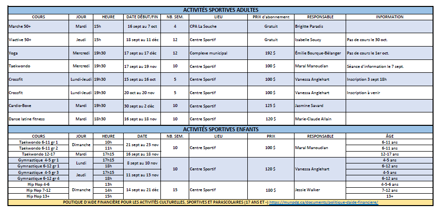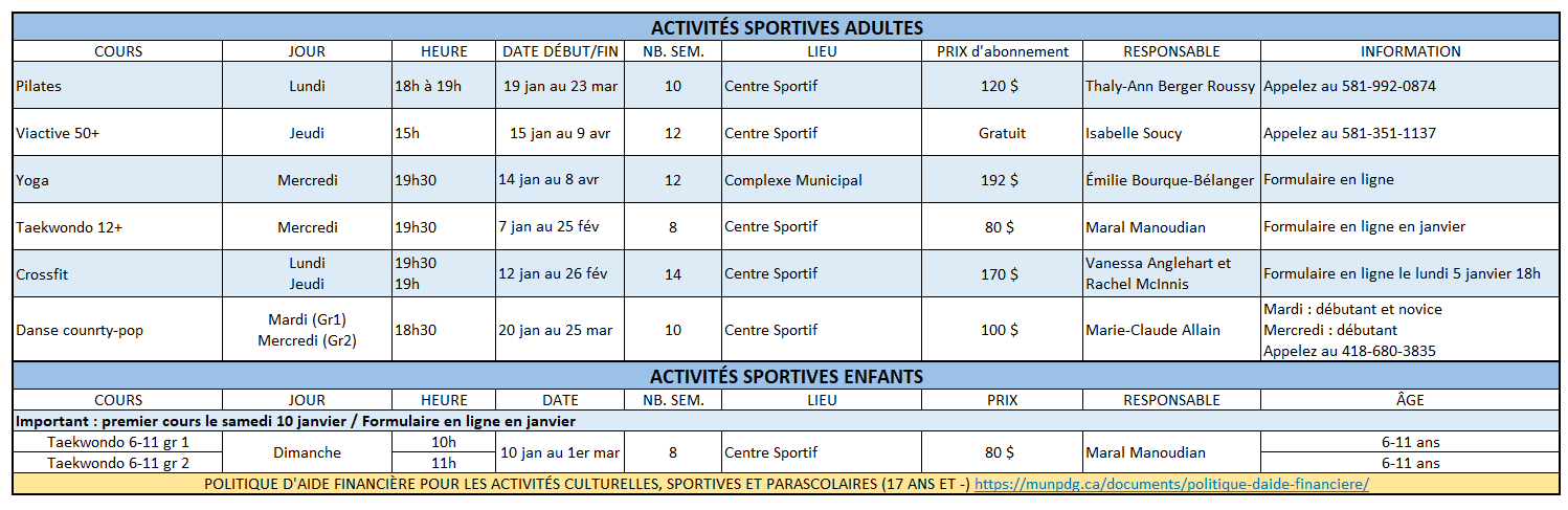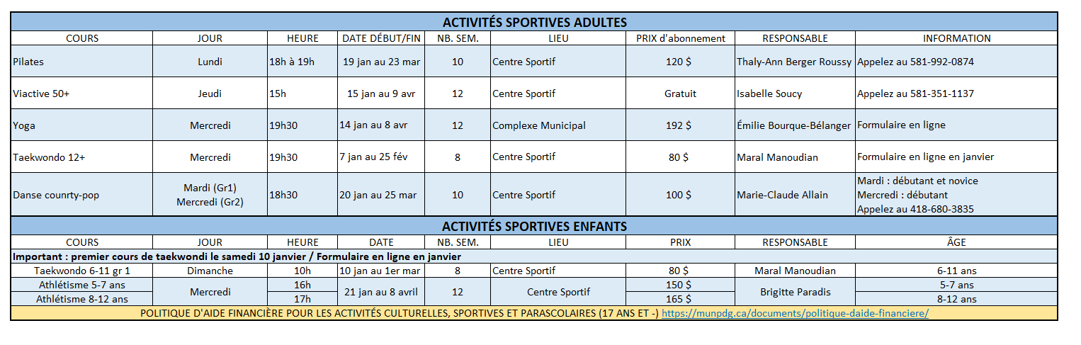 Horaire sujet à changement. Consultez notre page Facebook pour les horaires hebdomadaires : https://www.facebook.com/DLCT.MUNPDG.CA
